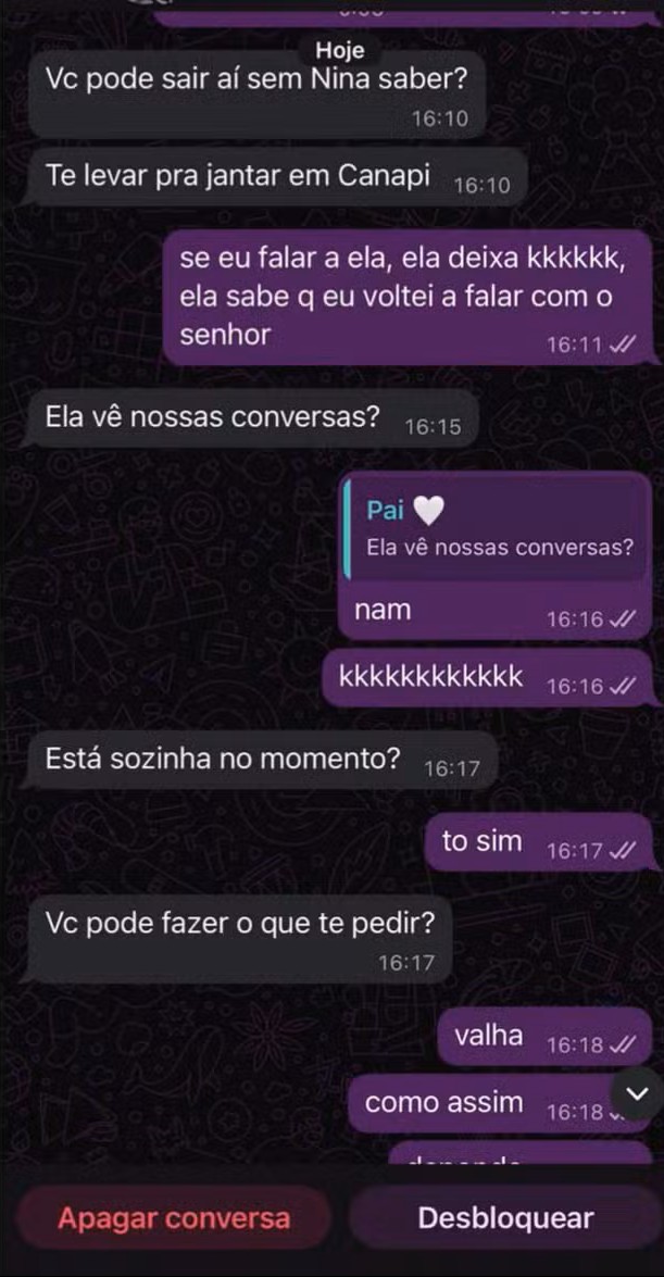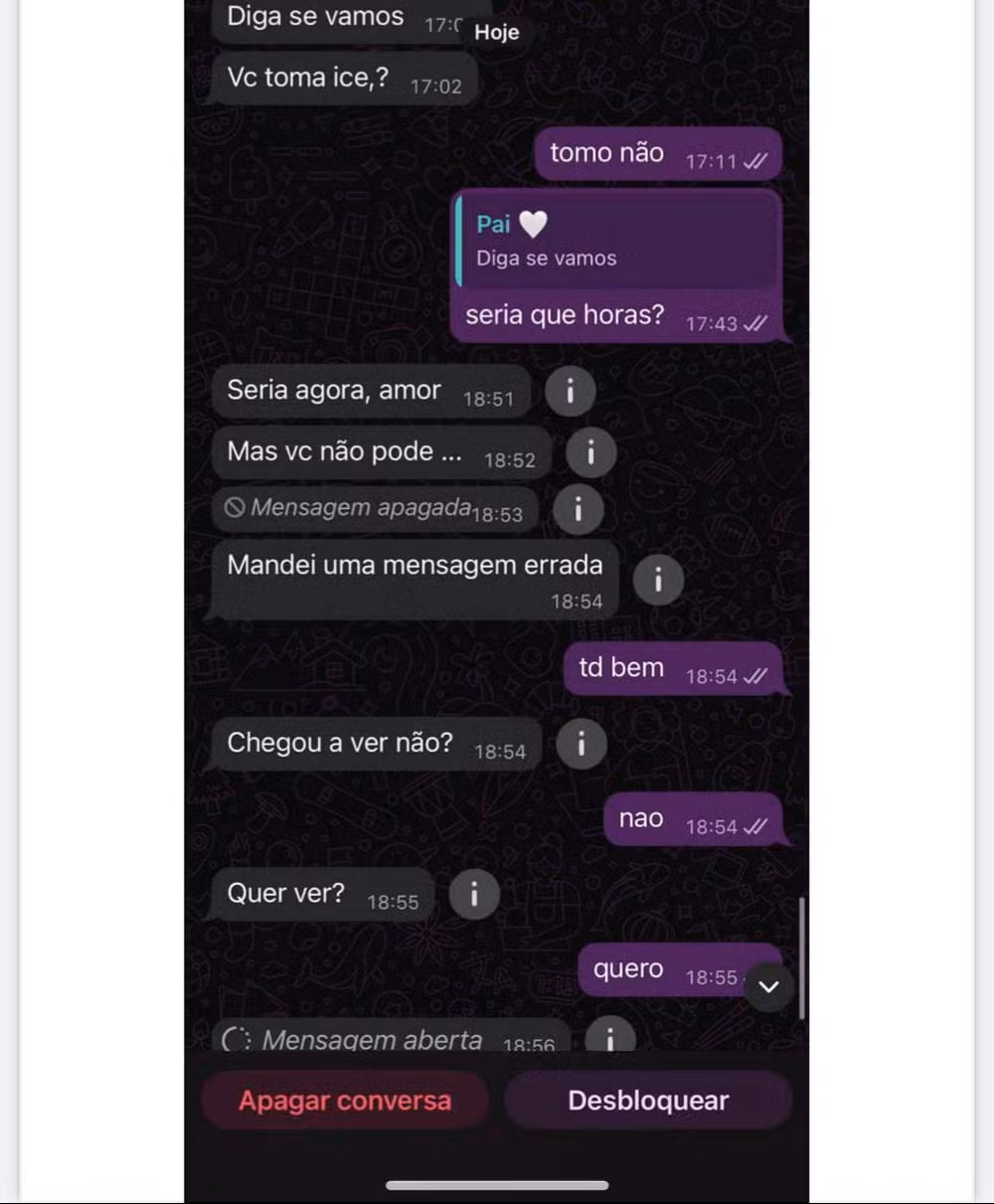 A conversa prossegue com o suspeito perguntando à filha se ela viu o vídeo e se gostaria de vê-lo. Em seguida, ele envia outro vídeo íntimo para a menor.