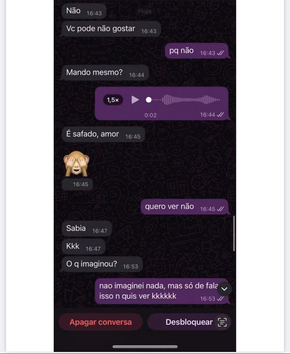 Após a recusa da jovem, ele insiste e chega a perguntar se ela ingere bebida alcoólica. Em seguida, o advogado envia um vídeo, apaga logo depois, e diz que o envio foi por engano.