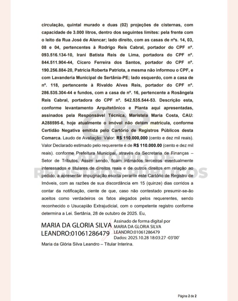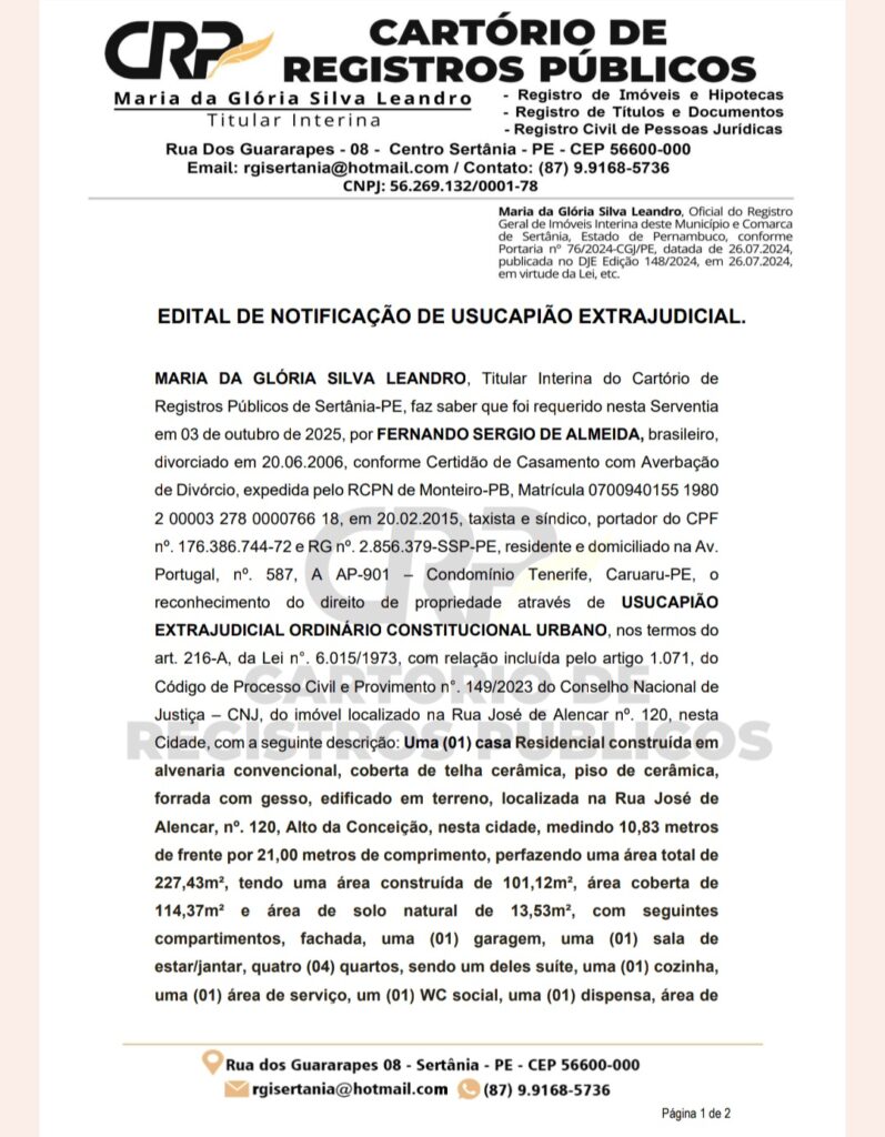 CARTÓRIO DE REGISTROS PÚBLICOS: EDITAL DE NOTIFICAÇÃO DE USUCAPIÃO EXTRAJUDICIAL Postado Por: redação tribuna do moxotó 13 de novembro de 2025 Comentários do Facebook