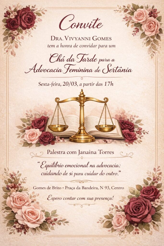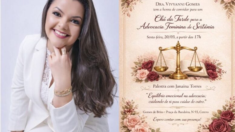 A cidade de Sertânia sediará, na próxima sexta-feira, 20 de março, o Chá da Tarde da Advocacia Feminina Sertaniense, iniciativa promovida pela advogada Maria Vivyanni Gomes Romão de Brito, inscrita na OAB/PE nº 52.469.