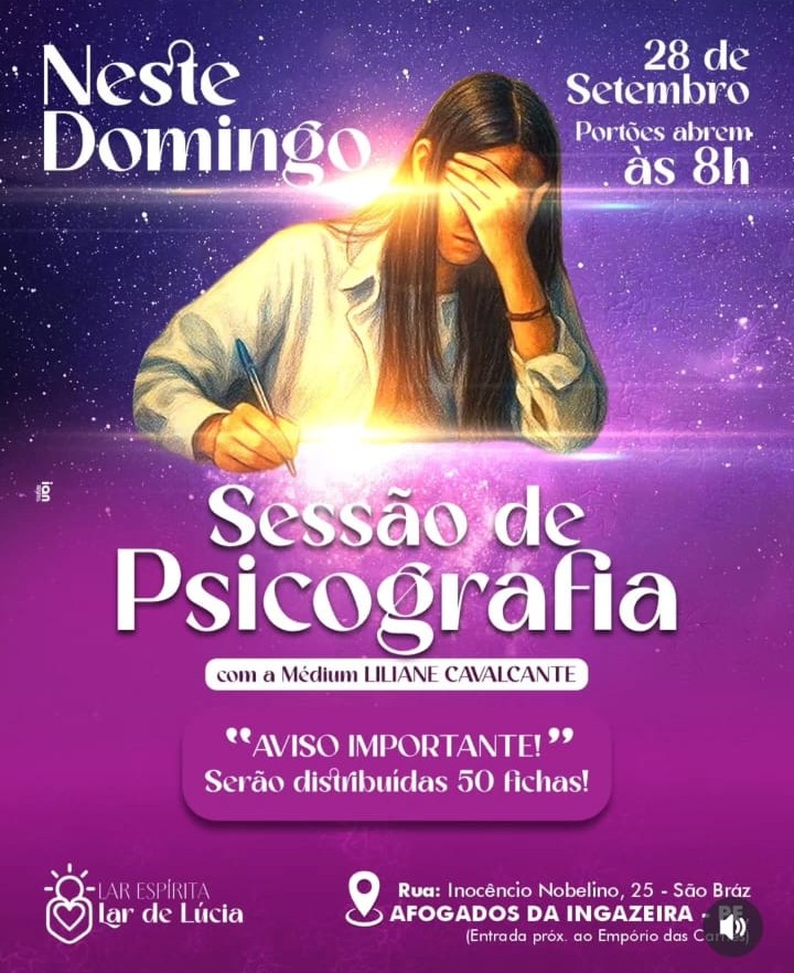 Neste domingo, dia 28, a partir das 8 horas da manhã tem atividades espirituais diversas no Lar Espírita Luz de Lúcia na cidade de Afogados da Ingazeira, inclusive, com psicografia com a médium Liliane Cavalcante.