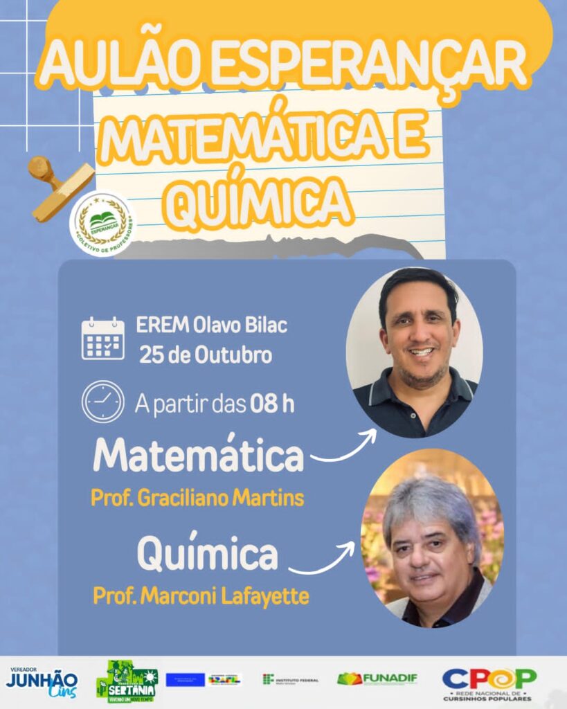 👉🏼 O pontapé inicial será dado na sexta-feira, 24 de outubro, a partir das 18h30, com uma jornada noturna de aprofundamento. As atividades continuam no sábado, 25 de outubro, a partir das 08h, uma manhã dedicada ao reforço das áreas mais desafiadoras. O Aulão Esperançar contará com a participação de docentes de destaque em suas áreas: