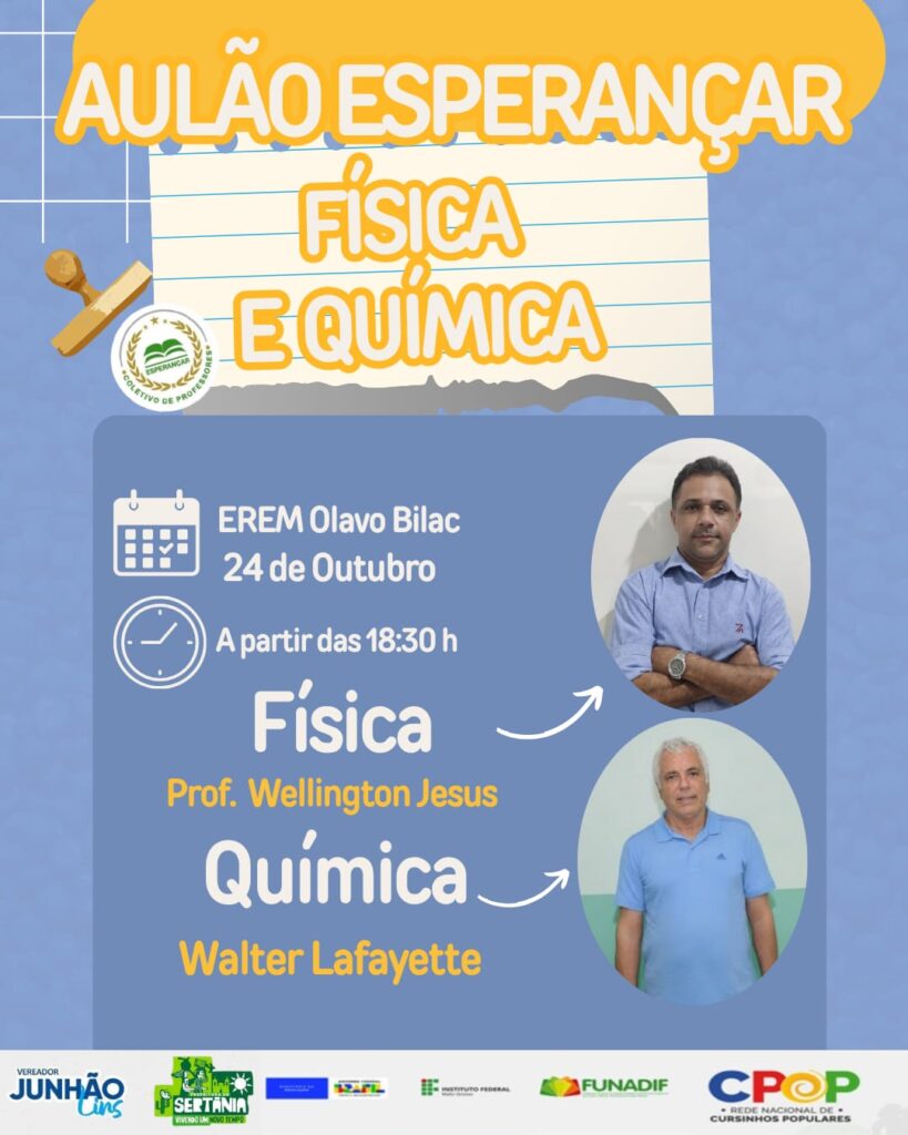 - Prof. Walter Lafayette (Química): Também sertaniense, o Prof. Walter Lafayette reforça a área de Ciências da Natureza, garantindo uma cobertura completa dos assuntos de Química.