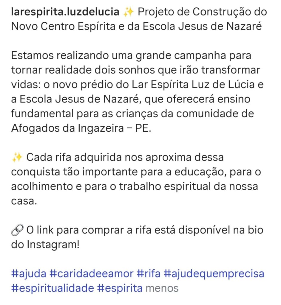 Você pode acompanhar as ações sociais do Lar Espiritual Luz de Lúcia pelas suas redes sociais. Ali todos conhecerão uma equipe que trabalha voltada para o bem comum de toda uma coletividade e para que essa obra chega mais longe ajudando mais a todos você pode contribuir com donativos e alimentos não perecíveis para serem distribuídos com aqueles mais carentes.