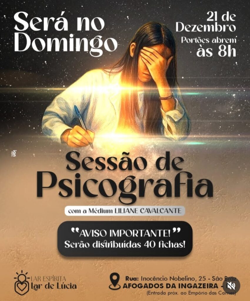 A médium irá abordar vários temas como tratamento espiritual, desafios frente dos trabalhos na psicografia e o que devemos esperar para 2026.
