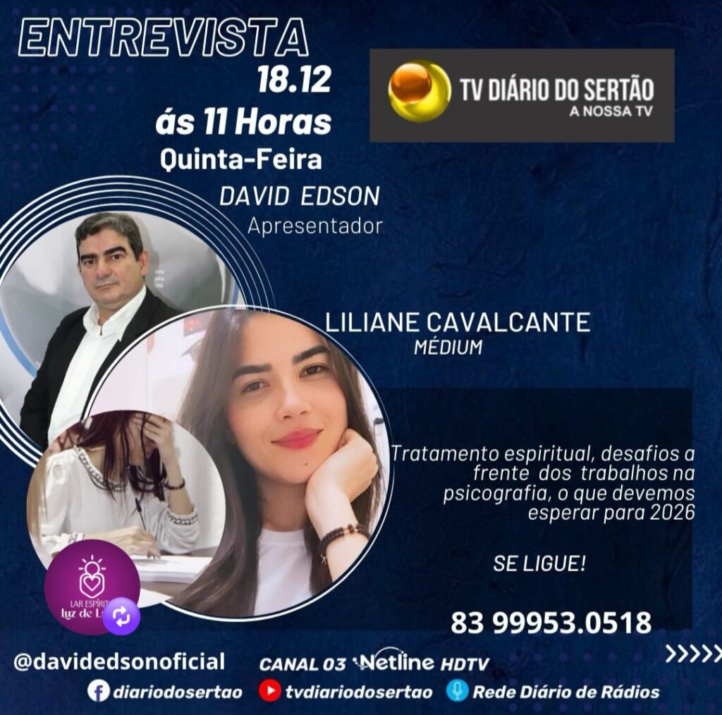A médium psicografista da cidade de Afogados da Ingazeira, Liliane Cavalcante, do Lar Espírita Luz de Lúcia, que vem, junto com sua equipe, fazendo um trabalho fraterno muito bonito em prol de toda comunidade da região e até de outros estados, estará concedendo uma importante entrevista para a TV diário do Sertão, sob a mediação do apresentador David Edson, a partir das 11 horas da manhã.